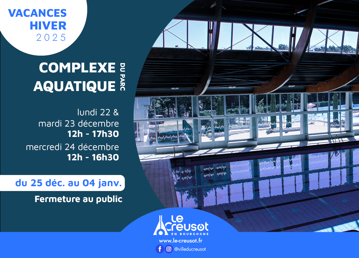 Il vous accueillera Lundi 22 et Mardi 23 décembre de 12h à 17h30 ; Mercredi 24 décembre de 12h00 à 16h30 (évacuation des bassins 15min avant).